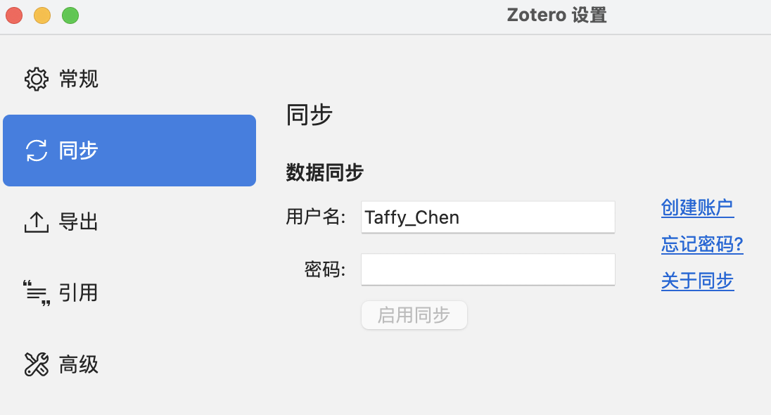 在 菜单栏点击“编辑- 首选项-同步”(Windows)/“Zotero-设置-同步”(MacOS),输入账户信息。