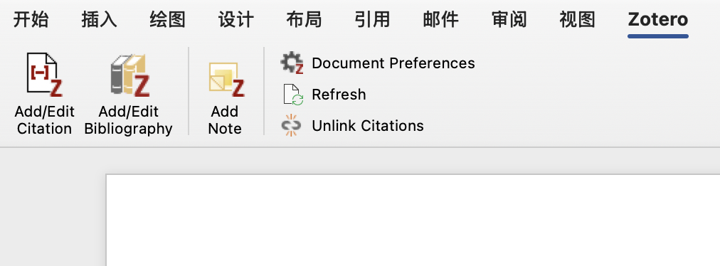 5.2 在Word中启用Zotero插件 本节介绍确认Zotero的Word插件已成功启用的方法。 通常情况下,安装Zotero桌面端时会自动安装对应的Word插件。 打开Microsoft Word。 检查是否存在Zotero选项卡或工具栏。 若可见Zotero相关按钮, 则插件已成功启用。