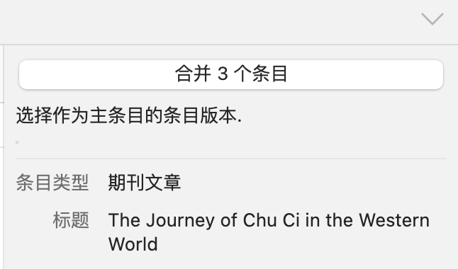 选中重复的一组文献,点击右上角的“合并条目”,Zotero将自动整合各条目的元数据。