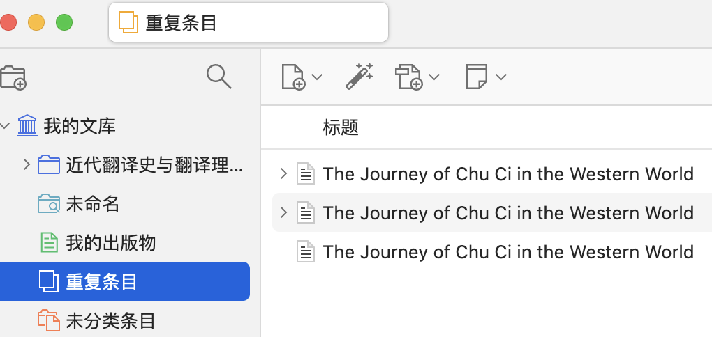 Note: 若侧栏中未发现“重复条目”,则该功能被隐藏,可以通过点击“我的文库”,右键选择“显示重复条目”。
