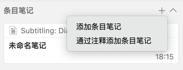 条目笔记: 附属于特定文献条目的子节点,用于记录针对该文献的摘要、评价或批注提取内容,在文献库中出现会出现在对应条目之下;