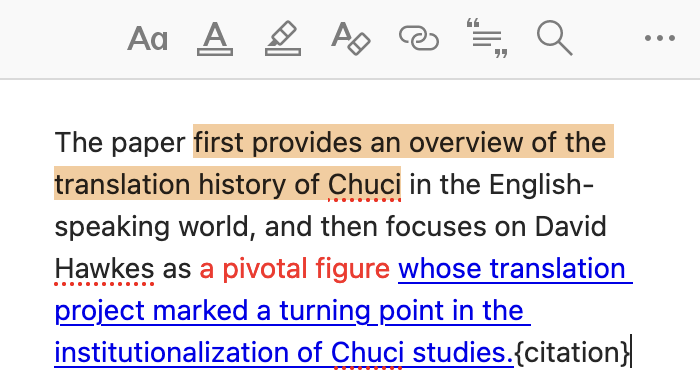 打开某一笔记,上方会出现文字编辑功能:“格式化文本”“文字颜色”“高亮文本”“清除格式”“添加链接”“插入引注”“查找替换”功能,可根据需要编辑文字。