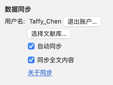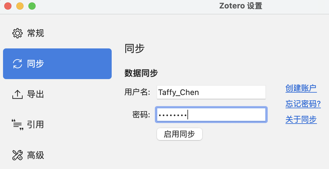 返回软件,在 菜单栏点击“编辑- 首选项-同步”(Windows)/“Zotero-设置-同步”(MacOS),输入用户名与密码,点击“启用同步”进入详细设置页。
