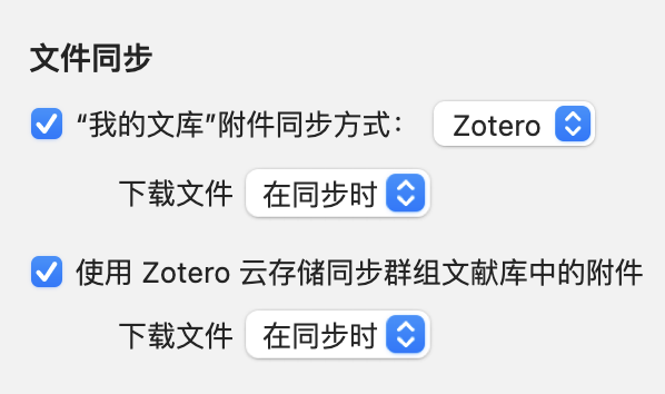 - 在“文件同步”区域,将同步方式设置为 “Zotero”。