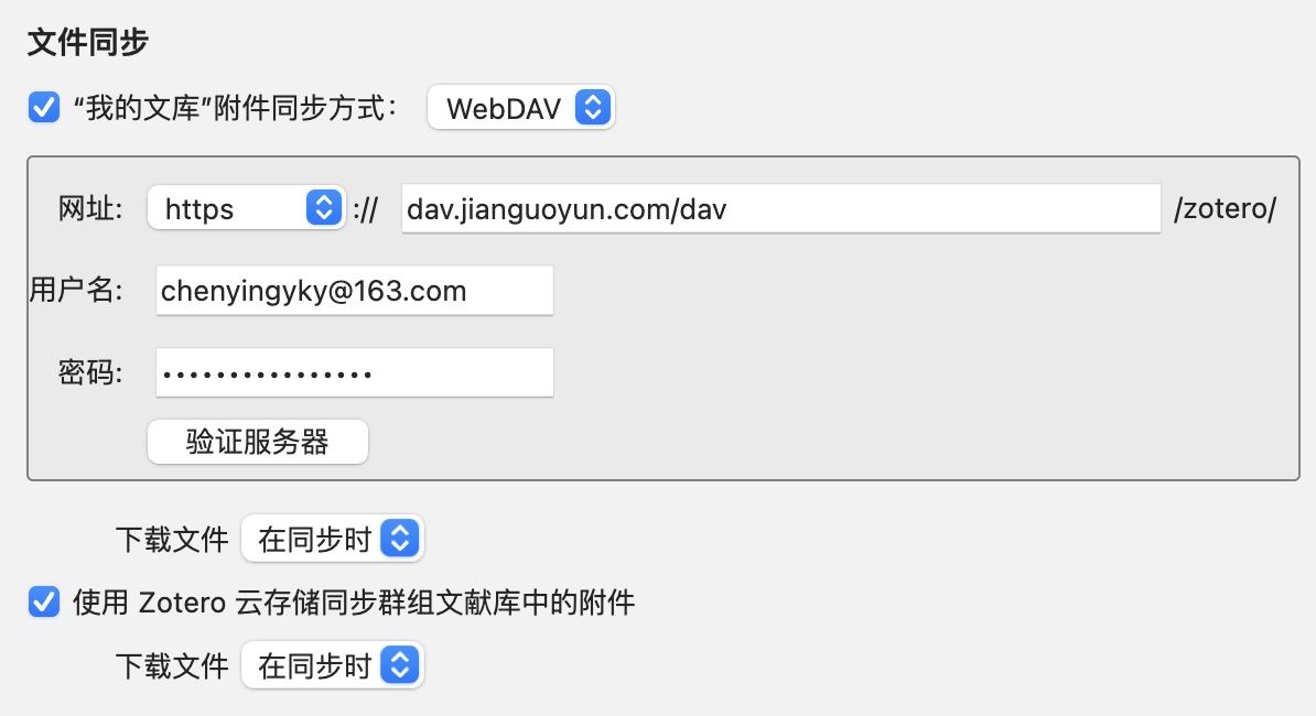 进入“编辑 – 首选项 – 同步”(Windows)/“Zotero – 设置 – 同步”(MacOS),完成 Zotero 账号登录后,在“文件同步”区域进行以下操作: